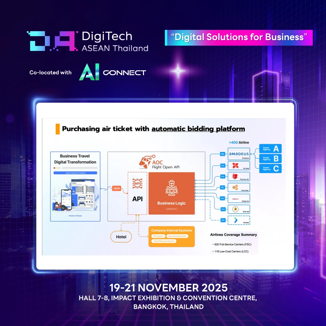 AOC – Flight Open API คือ บริการเชื่อมต่อ API เพื่อจองบัตรโดยสารสายการบินมากกว่า 400 สาย โดยแปลง Data ที่ซับซ้อนจำนวนมากให้กลายเป็นเพียง JSON message เพื่อให้ developer สามารถนำไปใช้งานได้ง่ายโดยไม่ต้องมีความรู้ด้านธุรกิจการบิน